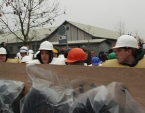 Kulkueen etummaisten rivien ihmiset kantoivat suojuksia kulkueen puolustamiseksi.