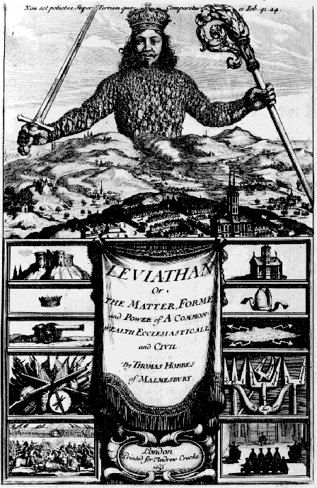 Toinen kuva yhteiskuntaruumiista tulee 1600-luvun Englannista, suurten mullistusten, muuttoliikkeitten ja uskonsotien ajalta. Thomas Hobbesin Leviathanin (1651) kansikuva on ehkä kuuluisimpia ja mielikuviin eniten vaikuttaneita poliittisen teorian kuvia modernilla ajalla. Hobbes kuvailee Leviathanin johdannossa tarkkaan tämän keinotekoisen ihmisen erilaisia ominaisuuksia muistia ja järkeä myöten, mutta hän ei puhu mitään jaloista. Mistä tämä johtuu? Jos katsomme tarkemmin tätä kuvaa, niin huomaamme, ettei tällä yhteiskuntaruumilla itse asiassa edes ole jalkoja, vaan miehen yläruumis nousee suoraan kukkulan laelta.