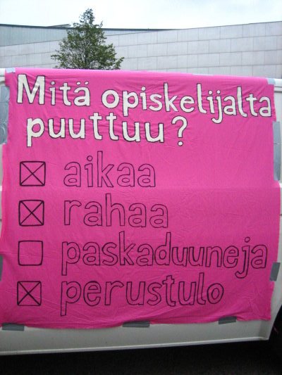 Noin 4000 opiskelijaa koonneessa mielenosoituksessa oli mukana myös perustuloa vaativia tunnuksia. Jaossa oli lentolehtinen, jossa sanottiin seuraavaa:
