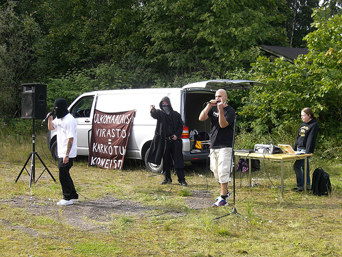 Puheenvuoron mielenosoituksessa esittivät Naze Aghai, Irakin pakolaisten kansainvälisen federaation Suomen osaston puheenjohtaja Omar Bahaaldin, Nazmi Basalak, kaupunginvaltuutettu ja SKP:n puheenjohtaja Yrjö Hakanen, Reza Kamangar, Unioni Naisasialiiton hallituksen jäsen Birgitta Kärkkäinen, Vihreiden nuorten ja opiskelijoiden liiton puheenjohtaja Tapio Laakso, Komala -puolueen edustaja Jaffar Nostafa Soltani, kansanedustaja Anni Sinnemäki (vihr), kansanedustaja Minna Sirnö (vas) ja Vasemmistonuorten pääsihteeri Sampo Villanen. Esiintymässä olivat SuperJanne sekä Julma-Henri ja Steen1.